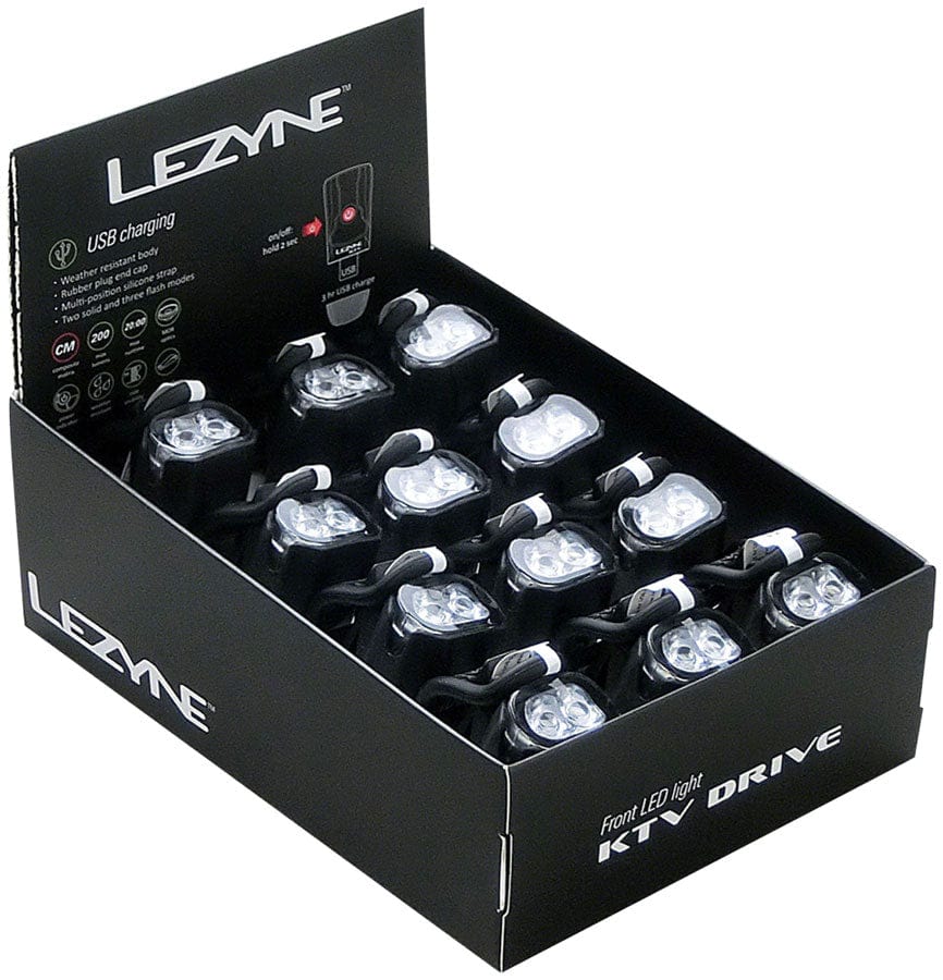The Lezyne KTV Drive Headlight features two bright LEDs and a 200-lumen Daytime Flash mode. It features a super lightweight yet durable co-molded construction that is IPX7 (waterproof) rated. Up to 20 hours of runtime and up to 200 lumens. And it features an integrated USB stick for convenient cable-free recharging.Run time: 2 - 20 hrs. Max lumens: 200 Provides 200 lumens from two ultra-bright LEDs Headlight mount easily on different diameters and shapes with wildly adjustable silicone strap USB recharging time of 3 hours