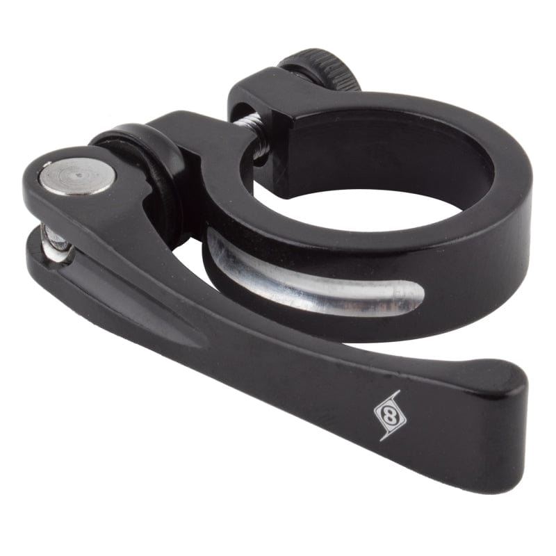 Seat clamp with extra leverage design. Black anodized and machined. Seat clamp with extra long quick release lever for added clamping force