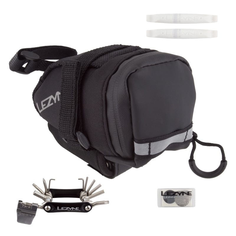 Durable Nylon seat bag loaded with some Lezyne trail essentials. Seat bag features a reflective light loop and reflective side lettering . Bag features internal mesh organization pocket. Included with the bag is a Smart kit for tire repair RAP 6 multi-tool and Matrix Tire levers