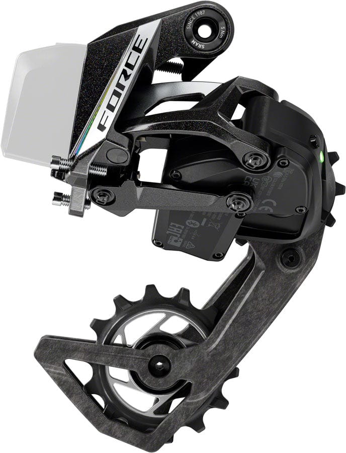 Lighter faster and more capable than ever the Force AXS 12-Speed rear derailleur does it all in style. Covering cassette ranges from 10-28t up to 10-36t this wireless wonder has a new lighter cage and a larger pulley wheel to increase drivetrain efficiency. One derailleur ready for 2x or 1x the steepest climbs and descents all while shedding 12g from previous generation Force.AXS enabled for easy setup personalization and reliability Compatible with both 2x and 1x drivetrains Compatible with cassettes from 10-28t to 10-36t Larger X-SYNC pulleys for increased efficiency Chain management technology keeps the drivetrain quiet.and secure Compatible with existing AXS batteries (Sold separately)