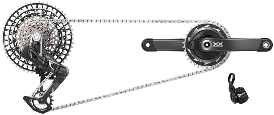 The pinnacle of cross-country cycling performance can be found in the SRAM XX SL T-Type Eagle AXS™ Transmission Power Meter Groupset. Built to serve the most demanding rider’s needs in the lightest weight configuration XX SL Transmission is the evolution of SRAM's World Champion World Cup winning XX Eagle AXS™.AXS™ Pod ULT features a “click and fire” two-button design that transforms the crucial act of rider inputs into a vastly more personal experience for all your AXS™ controls Engineered as integrated interdependent transmission components the XX SL Eagle T-Type rear derailleur mounts around the wheel axle itself contacting the cassette directly with a first-of-its-kind Hangerless Interface XX SL T-Type derailleur offers the same intuitive pairing and set-up procedure as SRAM's Eagle AXS™ derailleur To further its performance the lower pulley called "Magic Wheel" keeps spinning if an object becomes lodged Derailleur features an overload clutch that accommodates common maintenance Ultra-lightweight XX SL T-Type 10-52t cassette offers game-changing inboard and outboard shifting performance under load XX SL Eagle AXS™ T-Type Power Meter crankset boasts SRAMs XX SL carbon crankarm with an integrated power meter to record and deliver live accurate power readings to your head unit Power Meter spider-based design is highly accurate high performing and boasts a long battery life New spider design uses a proprietary threaded chainring mount system which reduces weight without compromising reliability Compatible with the RockShox Flight Attendant system allowing for total connectivity between all AXS™ enabled components XX SL Eagle T-Type Flattop Chain is specifically engineered to optimize Eagle Transmission and features a unique flat top that maximizes shifting performance and robustness 55mm Chainline 174mm Q-factor
