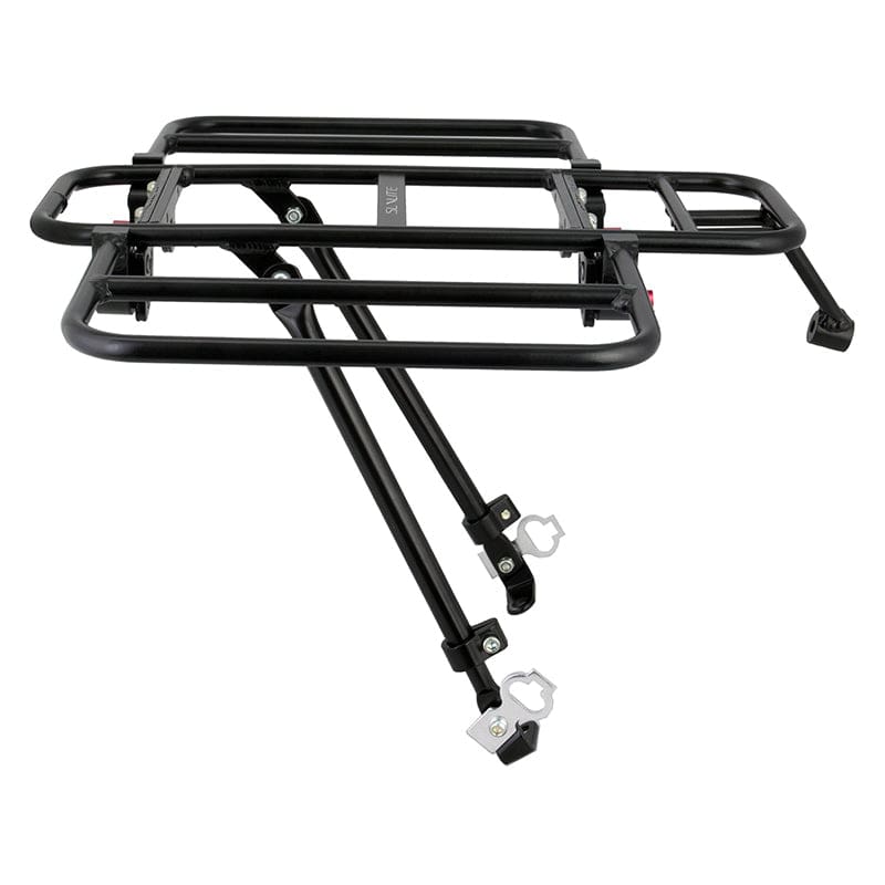 Front rack with foldable sides for an expandable platform size. Sturdy powder coated alloy construction. Can be attached to brake mounts or threaded accessory eyelets. Adjustable legs fit 26` - 29` frame sizes. 22lb weight limit