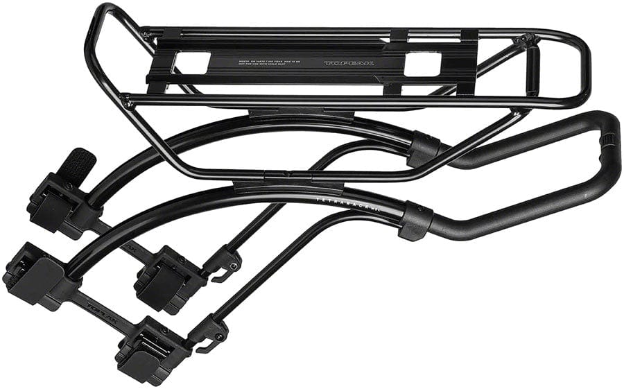 The perfect quick-mount rear rack system attaches to MTB full suspension seatstays or hardtail MTB without rack eyelets. This large rear rack features an innovative top plate that adjusts to level independent of the seatstay angle. Integrated QuickTrack® system allows Topeak TrunkBags / TrunkBox to slide and lock into place and release with the push of a button. Innovative hook and loop strap mounting system cinches down tight to keep the load stable and allow mounting on a wide range of bikes. Also compatible with KLICKfix® / RackTime® Snapit or Vario system bags.Strut slot adjustments allow the rack top plate to be level independent of the seatstay angle Adjustable straps with padded feet securely attach rack to seat stays