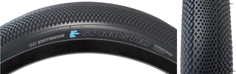 The Speedster was designed for rolling speed and minimal drag on hard pack or paved terrain. Count on this tire for high performance during BMX racing dirt jumps and urban shredding. Perfomance compound provides durable reliable traction. OR - Vee`s OverRide technology offers 3 times the puncture protection over previous non-OverRide models. EBIKE50 - has achieved a passing rating for use with E-Bikes up to 50kph and is ECE-R75 approved