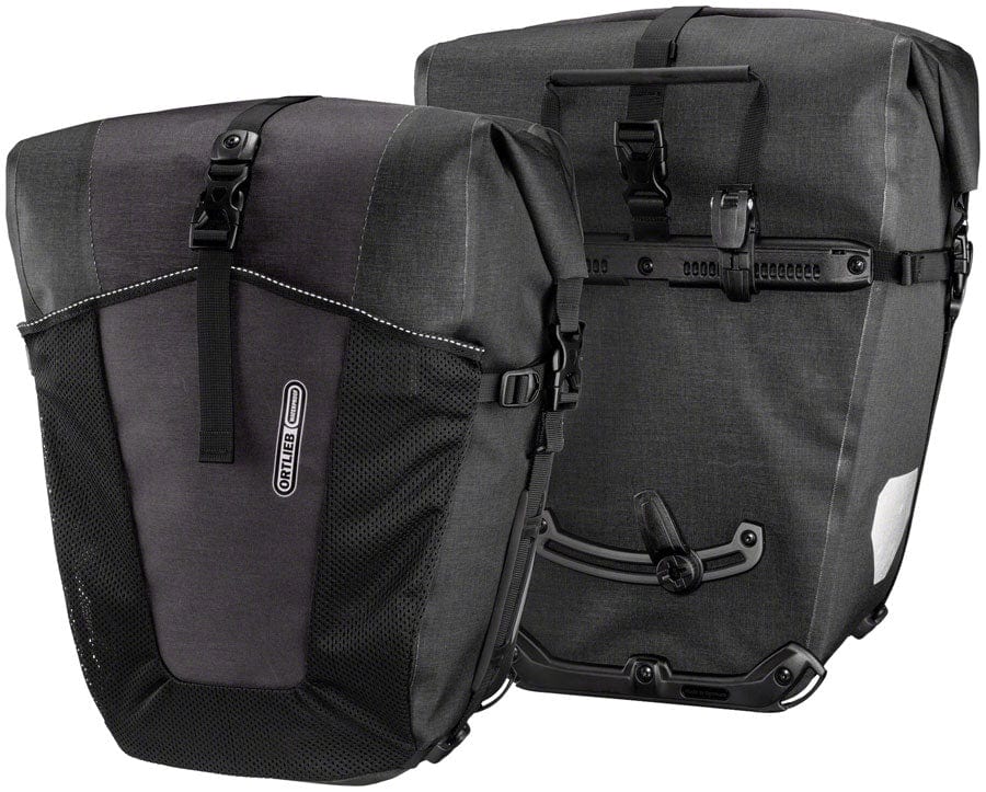 The Back-Roller Pro Plus is the XL version of the popular Back-Roller Plus touring bag. With a volume of 70 liters per pair it offers almost twice as much stowage space. It’s also the first ORTLIEB Back-Roller with an additional front pocket. Although not waterproof the pocket is unusually practical offering 4 liters of space for water bottles sunscreen wet things and other items. The durable Codura fabric gives the bag a noble woven-fabric look and is also completely PVCfree. The proven roll closure keep the contents of the inner compartment clean and dry at all times. Thanks to the ingenious QL2.1 system with its self-closing hooks you can conveniently mount your bags on almost any bike rack.Outer front pocket (2 x 4 L) folds flat with reflective thread ideal for damp clothing Material: PU-laminated Cordura Integrated inner pocket and shoulder strap QL2.1 mounting system for racks with tube diameter max. 16 mm Reduction inserts for tube diameters 8 10 und 12 mm with anti-scratch-function protecting the rack from abrasions Two strong 3M Scotchlite reflectors Upper QL-hooks and lower hook adjustable without requiring any tools Lower hook with anti-scratch function protecting the rack from abrasions Symmetrical shape allows use on right or left side