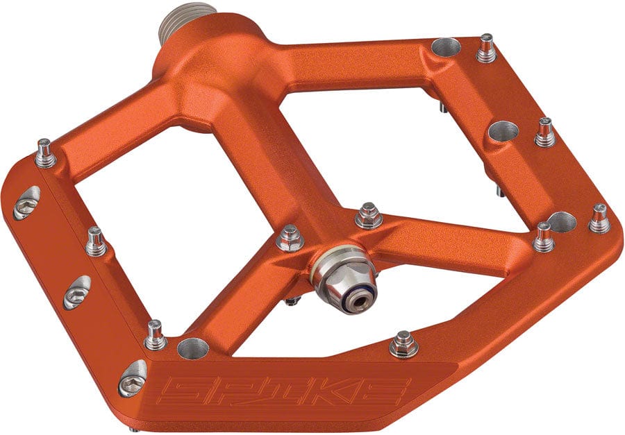 Spank Spike Pedals feature an aluminum body with a full-anodized finish with steel replaceable pins for durability and traction. The axle is designed to not interfere with crank boots. Slim 12mm race and freeride pedal for maximized pedaling clearance Forged alloy body is shot peened and anodized for increased durability Equipped with hollow taper chromoly steel axles for strength Sealed bearings and IGUS bushings 20 preassembled pins in virtual concavity for ultimate grip Recommended for: ASTM 5 All mountain free ride DH E-Bike Crank boot compatible axle