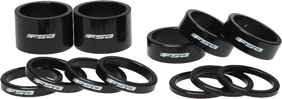 FSA (Full Speed Ahead) Headset Spacer Kits.Three 3mm Spacers Four 5mm Spacers Three 10mm Spacers Two 20mm Spcers All Spacers have FSA logo except 3mm