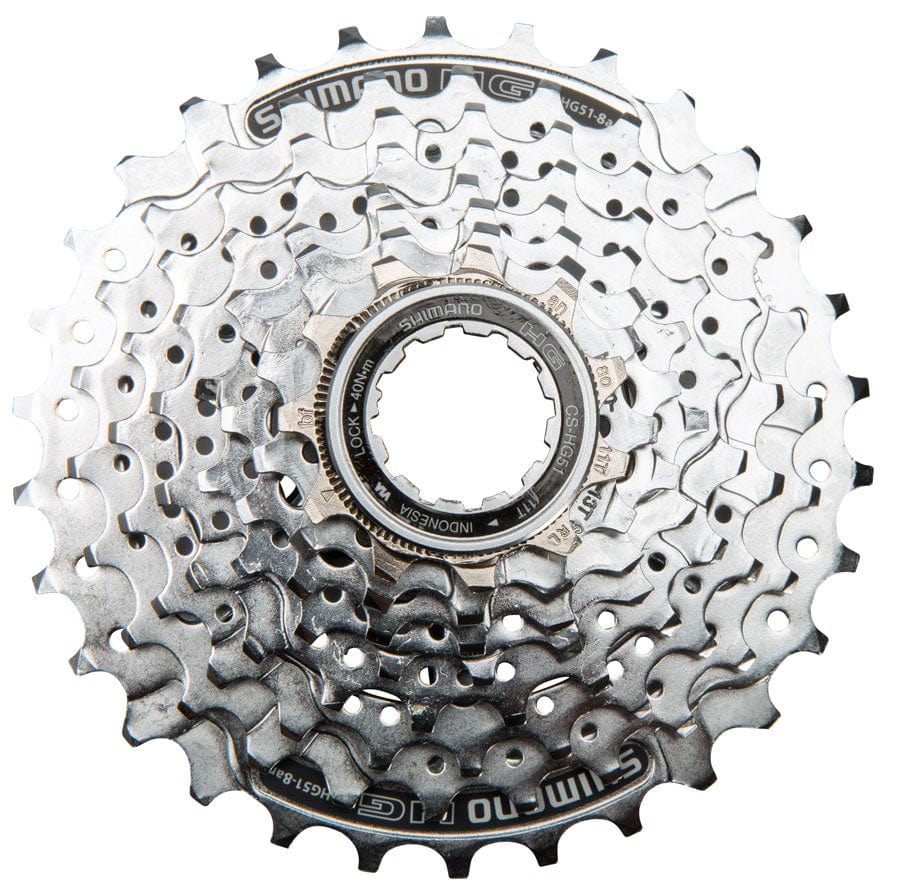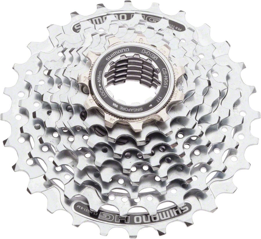 Shimano CS-HG51 8-Speed cassettes feature Hyperglide technology for reliable shifting performance and chrome plated steel gears for added corrosion resistance.Hyperglide technology provides smooth shifting Chrome plated steel gears and lockring Compatible with Shimano HG and IG chains Drilled cogs reduces weight