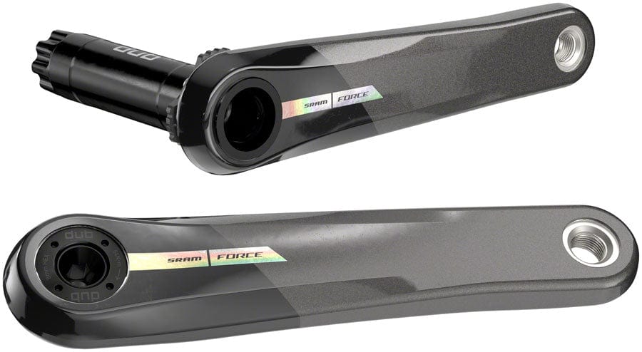 This SRAM Force carbon crank arm assembly features stunning Force AXS graphics. The 8-bolt interface will fit any SRAM AXS spider or integrated chainring with or without power. The light stiff and durable DUB spindle interface also fits nearly any frame.8-bolt interface compatible with power and non-power AXS spidersand integrated chainrings DUB bottom bracket (Sold separately) adds durability and simplicity Carbon fiber arms with gloss finish are lightweight and incredibly strong Bottom bracket/Spider/Chainrings not included