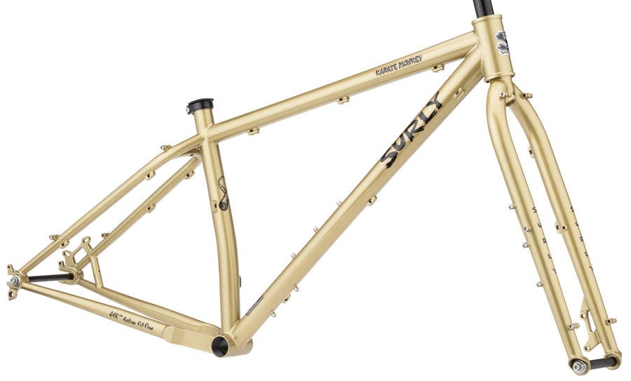 The Karate Monkey features updated progressive trail geometry our custom trumpet tubeset and Surly’s Gnot-Boost rear dropout system. Available in a variety of colors with multiple drivetrain and wheel size configurations.100% Surly Chromoly steel frame and fork; double-butted main triangle and 44mm headtube The tubeset uses the same trumpet tubes found on Instigator 2.0 frame Adjustable rear dropouts with 145mm Gnot-Boost spacing. Works with 142 148 12mm thru as well as 135mm w/ 10/12 washer Internal dropper seatpost routing with 30.9mm seat tube ID Clearance for 29 x 2.55 or 27.5 x 3 tires