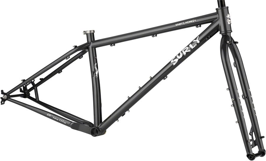 The Karate Monkey features updated progressive trail geometry our custom trumpet tubeset and Surly’s Gnot-Boost rear dropout system. Available in a variety of colors with multiple drivetrain and wheel size configurations.100% Surly Chromoly steel frame and fork; double-butted main triangle and 44mm headtube The tubeset uses the same trumpet tubes found on Instigator 2.0 frame Adjustable rear dropouts with 145mm Gnot-Boost spacing. Works with 142 148 12mm thru as well as 135mm w/ 10/12 washer Internal dropper seatpost routing with 30.9mm seat tube ID Clearance for 29 x 2.55 or 27.5 x 3 tires