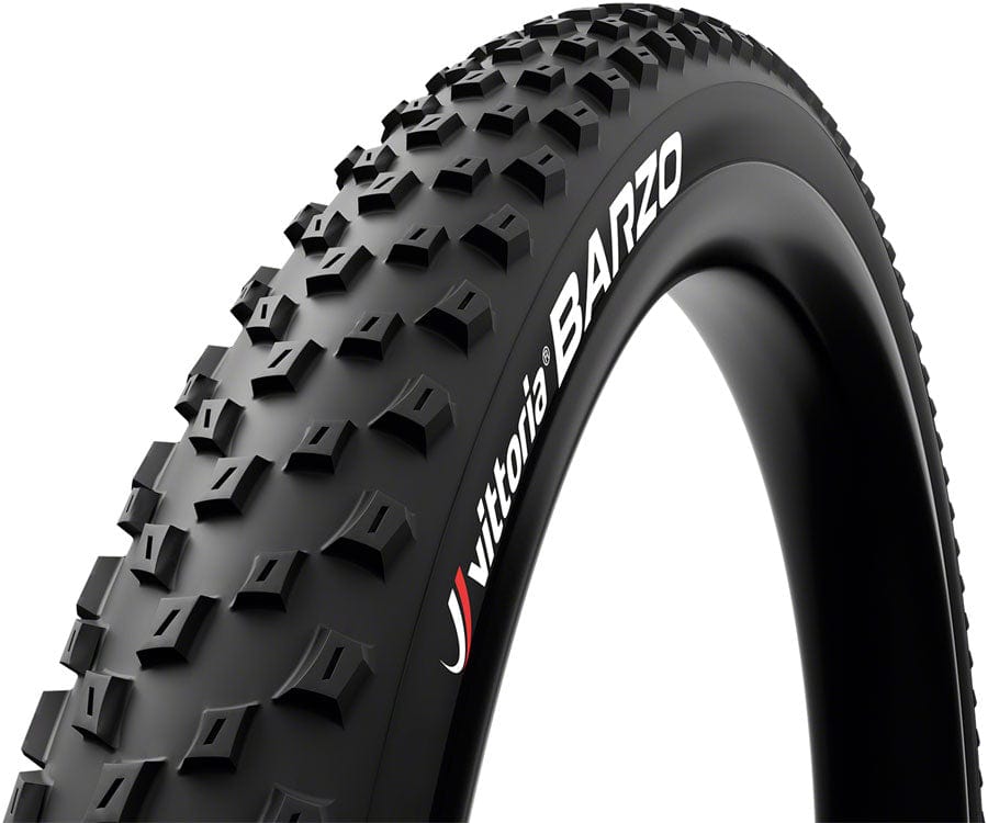 The technical small-block tread layout of the Vittoria Barzo tire has constant effective-edge center and lean-dependent sipe angles.Center tread consists of an alternating ridge pattern with progressive sipe angles Shoulder tread utilizes a moto-style block knob in a V-formation Designed for performance in rough and smooth hardpack