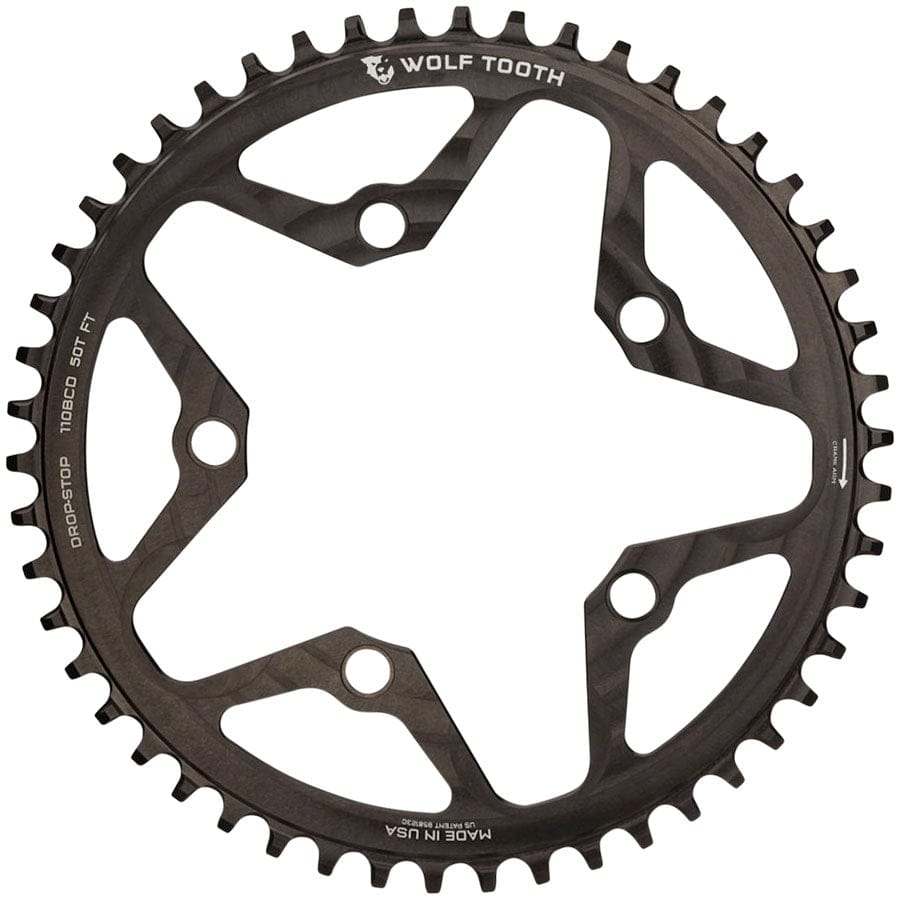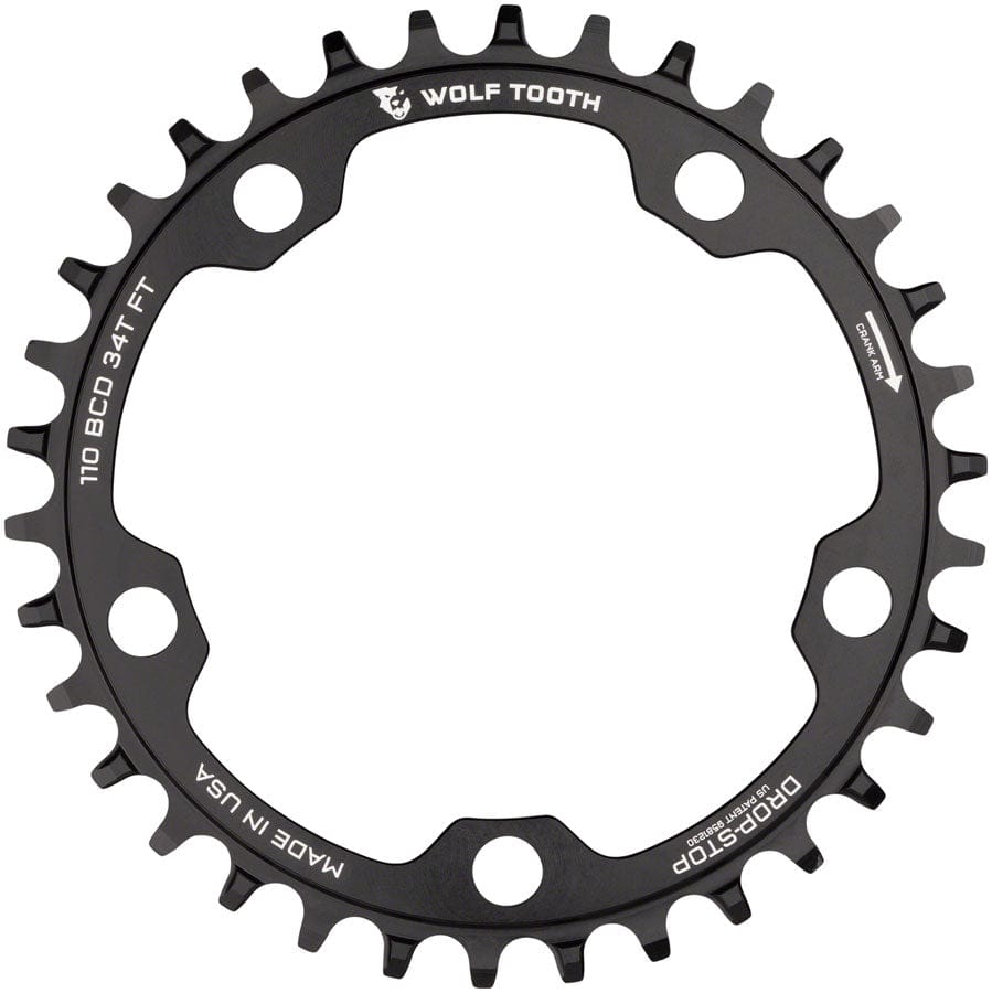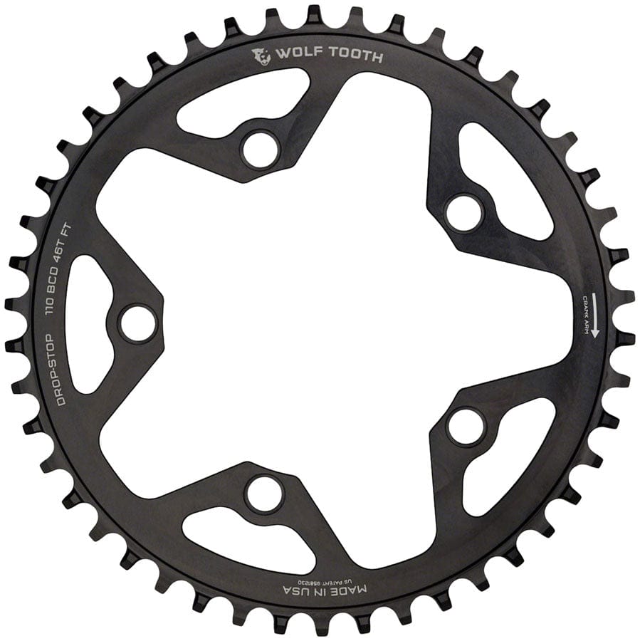 The perfect 1x solution for your gravel CX or road bike. Made from 7075 Aluminum Wolf Tooth's patented Drop-Stop design helps clear mud while retaining your chain.Features Wolf Tooth's Drop-Stop tooth design for maximum chain retention Drop-Stop chainrings are designed for use with 1x9 1x10 1x11 and 1x12 drivetrains Drop-Stop FT is compatible with all 10- 11- and 12-speed chains (including SRAM Flattop 12-speed chains) with the exception of Shimano 12-speed chains Shimano 12-speed chains require the use of Wolf Tooth's Shimano 12-speed specific chainrings If using a 9-speed drivetrain use a 10-speed chain which will provide a tighter fit for better chain retention Not compatible with Shimano Asymmetric 110 BCD cranks or Campagnolo CX10/11 cranks Use of a clutch-style rear derailleur is recommended Made from 7075-T6 aluminum for long life