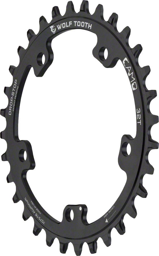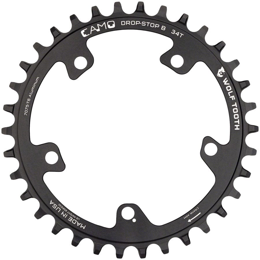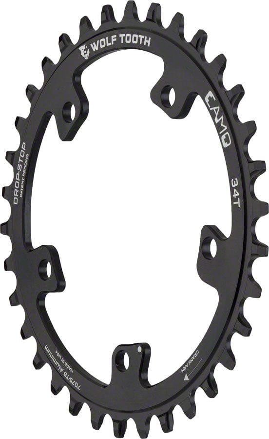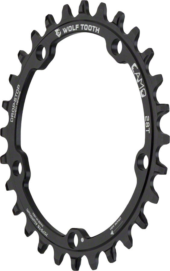 Wolf Tooth's CAMO is all about choice - this premium 7075-T6 Aluminum Alloy chainring is equipped with the patent pending Drop-Stop asymmetrical tooth design for the best in wear life mud clearance and chain retention.. Only compatible with Wolf Tooth CAMO spiders.Requires the use of a CAMO spider Drop-Stop chainrings are designed for use with 1x9 1x10 1x11 and 1x12 drivetrains Compatible with all 10- 11- and 12-speed chains with the exception of Shimano 12-speed chains Shimano 12-speed chains require the use of Wolf Tooth's Shimano 12-speed specific chainrings If using a 9-speed drivetrain use a 10-speed chain which will provide a tighter fit for better chain retention Made from premium 7075-T6 aluminum for durability and weight savings Use of a clutch-style rear derailleur is recommended