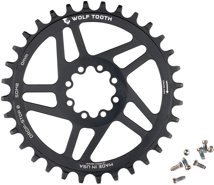 These Wolf Tooth direct mount rings are designed for SRAM cranks with 8-bolt mounting. This chainring is equipped with the patent pending Drop-Stop asymmetrical tooth design for the best in wear life mud clearance and chain retention.Drop-Stop chainrings are designed for use with 1x9 1x10 1x11 and 1x12 drivetrains Compatible with all 10- 11- and 12-speed chains with the exception of Shimano 12-speed chains Shimano 12-speed chains require the use of Wolf Tooth's Shimano 12-speed specific chainrings Compatible with SRAM AXS cranksets and other cranks that use the 8-bolt mounting Includes set of 8 custom T20 stainless steel bolts Made from 7075-T6 aluminum for long life