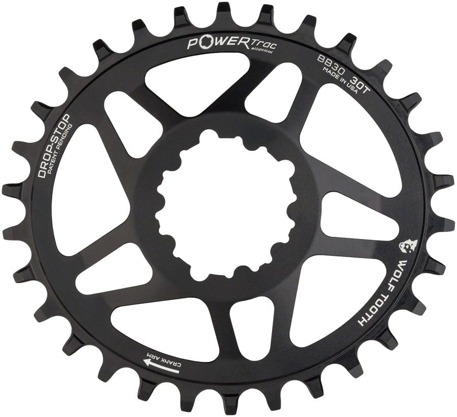 Designed to fit SRAM cranksets with removable spiders. Its proprietary design has an ovality of 10% and a timing of 112 degrees after top dead center which provide the beneifits of an oval ring such as greater rear wheel traction without the traditional downsides of oval rings.Elliptical rings provide smoother more efficient pedal rotation which means better traction Drop-Stop chainrings are designed for use with 1x9 1x10 1x11 and 1x12 drivetrains Compatible with all 10- 11- and 12-speed chains with the exception of Shimano 12-speed chains Shimano 12-speed chains require the use of Wolf Tooth's Shimano 12-speed specific chainrings If using a 9-speed drivetrain use a 10-speed chain which will provide a tighter fit for better chain retention Not compatible with the SRAM RED and Force AXS 8-bolt interface Made from 7075-T6 aluminum for long life Use of a clutch-style rear derailleur is recommended