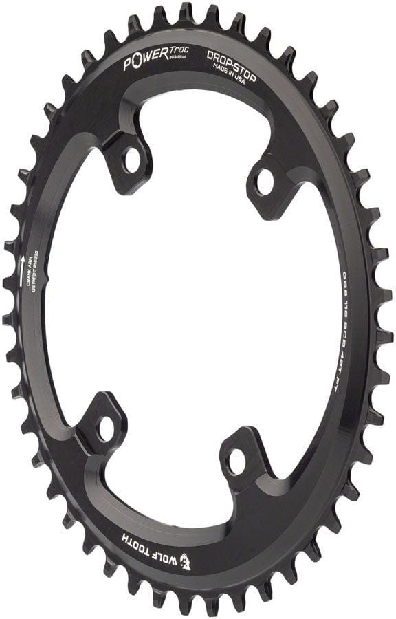Designed to fit Shimano GRX 4-bolt 110 Asymmetric BCD cranksets. The design has an ovality of 10% and a timing of 112 degrees after top dead center which provide the beneifits of an oval ring such as greater rear wheel traction without the traditional downsides of oval rings. These rings feature Wolf Tooth's Drop-Stop asymmetrical tooth design for the best in wear life mud clearance and chain retention.Compatible with Shimano GRX cranksets including RX600 and RX810 The Powertrac elliptical design means the diameter is that of a chainring 2t bigger Drop-Stop chainrings are designed for use with 1x9 1x10 1x11 and 1x12 drivetrains Compatible with all 10- 11- and 12-speed chains with the exception of Shimano 12-speed chains Shimano 12-speed chains require the use of Wolf Tooth's Shimano 12-speed specific chainrings If using a 9-speed drivetrain use a 10-speed chain which will provide a tighter fit for better chain retention Use of a clutch-style rear derailleur is recommended Made from 7075-T6 aluminum for long life