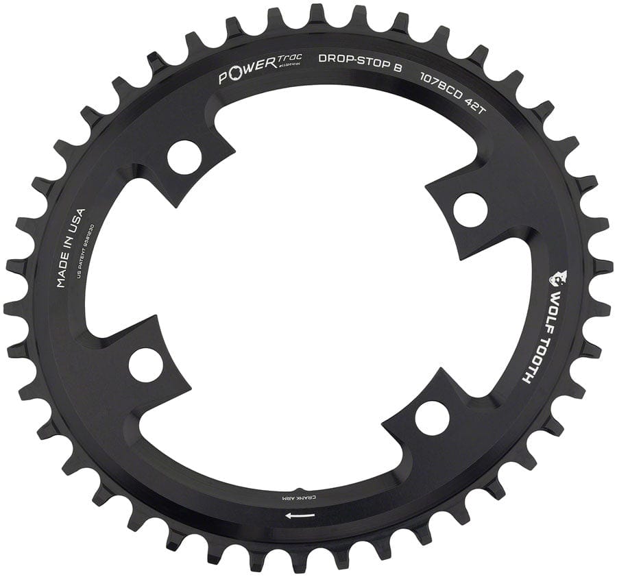 The Wolf Tooth Elliptical 107 BCD Chainring for SRAM cranks is compatible with most new SRAM 1x road cranks that use the 107 BCD spider including the SRAM AXS Power Meter Spider. This chainring uses the patented Wolf Tooth Drop-Stop B Wide/Narrow tooth profile that is optimized for drop bar bikes and designed best wear life mud clearance and chain retention.Elliptical chainring shape provides better efficiency in the recovery zone as well as increased traction thanks to consistent torque Drop-Stop chainrings are designed for use with 1x9 1x10 1x11 and 1x12 drivetrains Compatible with all 10- 11- and 12-speed chains with the exception of Shimano 12-speed chains Shimano 12-speed chains require the use of Wolf Tooth's Shimano 12-speed specific chainrings Fits 107 BCD spiders Made from 7075-T6 aluminum for long life