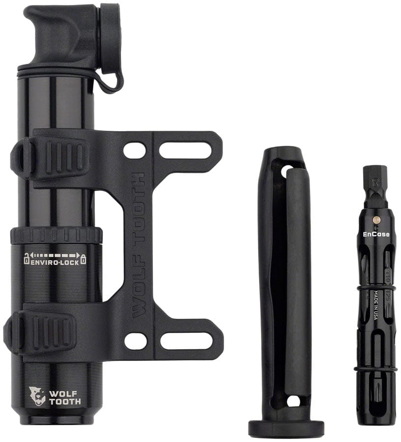 The Wolf Tooth EnCase Pump offers easy access quick use and reliable performance for mountain gravel and fat bike tires. It requires less force per stroke than competitors making it efficient for high-volume tires. The EnviroLock sealing protects internal components from water and debris. The pump is easily accessible when mounted on a frame ensuring it remains clean and ready to use. Part of the EnCase System The pump can store an EnCase System tools.Designed for high-volume tires with less effort per pump stroke Enviro-Lock sealing protects internal components from water and debris Fits EnCase System multi-tools or tubeless tire plug inside the pump Precision machined 6061 aluminum body for long-lasting use