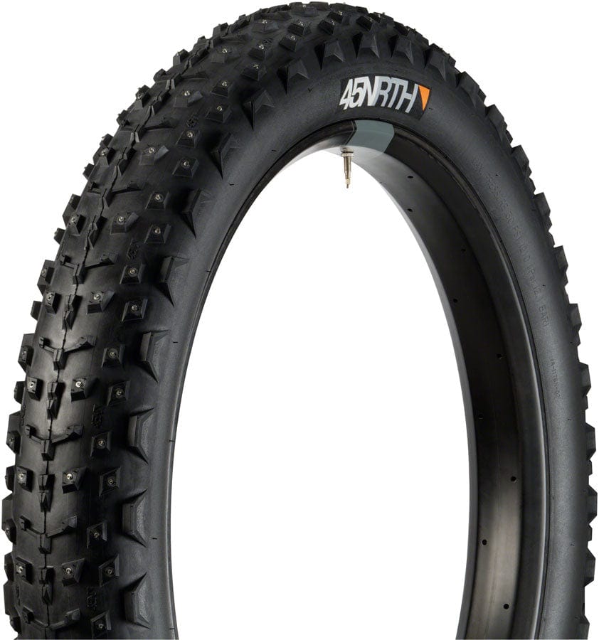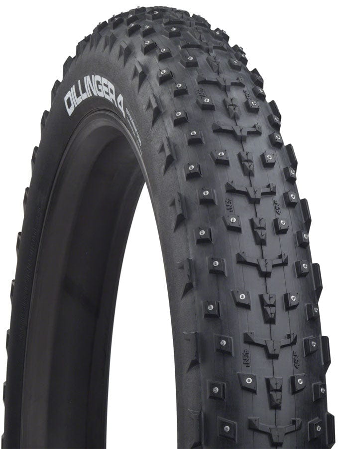 Dillinger 4 is a fast traction studded fat bike tire. The tightly spaced center tread rolls quickly while taller braced side lugs improve cornering in snowy conditions. Carefully positioned studs allow for railing icy off-camber singletrack with confidence and control.Braced side lugs for improved cornering Directional center lugs for rolling speed and braking traction Replacement studs and stud insertion tool sold separately