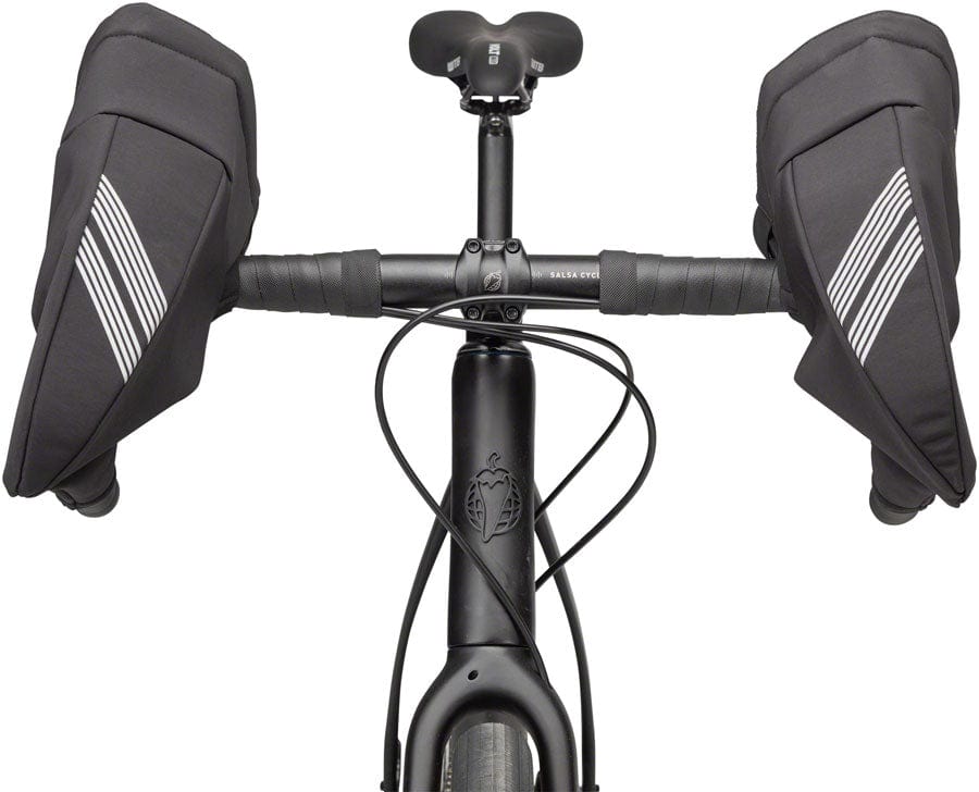 Draugenklaw Drop-Bar Pogies keep hands warm and dry and allow for full use of brake and integrated shift levers on cold commutes training rides race days and touring in uncertain weather. Weather-resistant softshell fabric on the outside defends against wind and water. On the inside soft fleece traps warmth for a cozy cockpit. Easy installation means you can put them on only when ride conditions call for it. Maximize comfort and minimize weight with Draugenklaw Drop-Bar Pogies.Wind resistant soft shell coverage Hook and loop opening for handle bars Designed to fit drop bar handlebars with variable flares Reflective printing