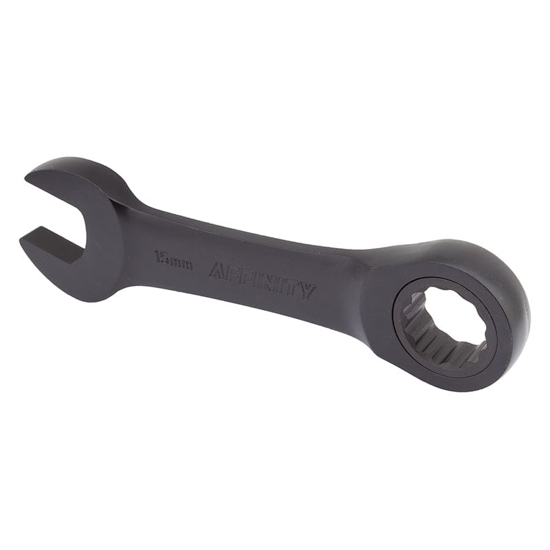 Combination open end and ratcheting box end 15mm wrench. Slim design available in two lengths for the tool box saddle bag or pocket. Durable chrome vanadium steel construction