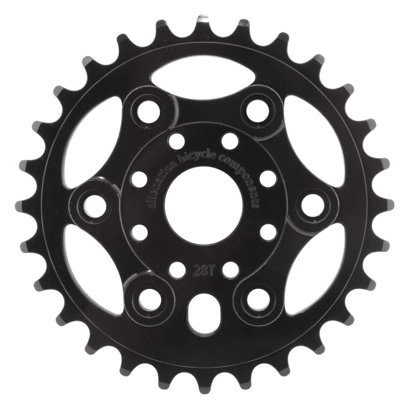BMX chainring with a design patterned after bicycle chains. 100% CNC Machined 7075 Aluminum. Offset 1/8” teeth provide improved chain alignment. 15/16` (24mm) bore with 19mm & 22mm adaptor