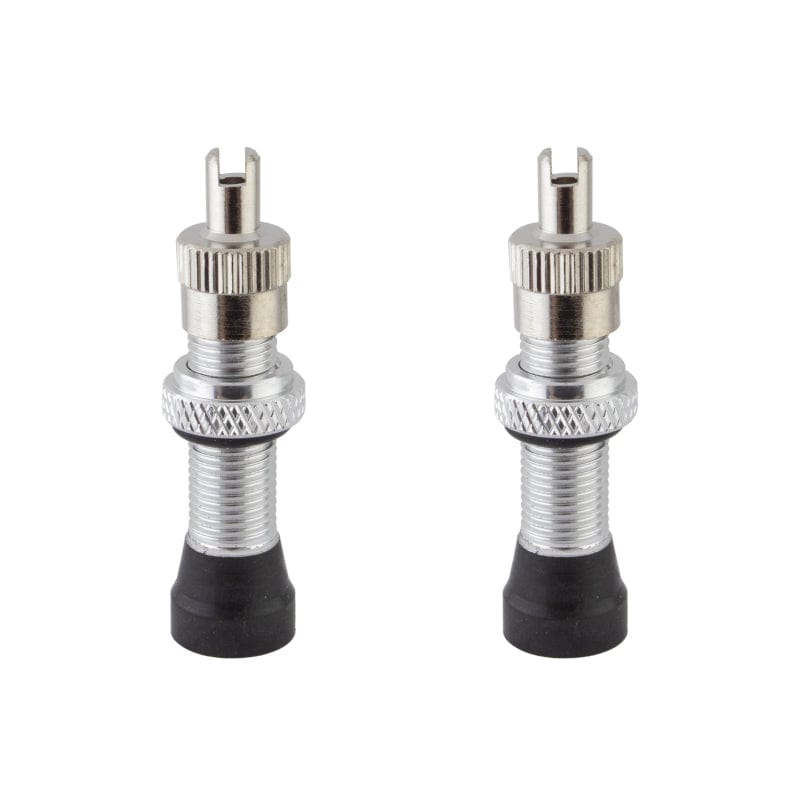 Tubeless Schrader valves made from lightweight alloy with removable cores. Taper design allows for optimal fit on a wide variety of rims. Cap seconds as core remover. Available in black or silver finishes. Sold in pairs