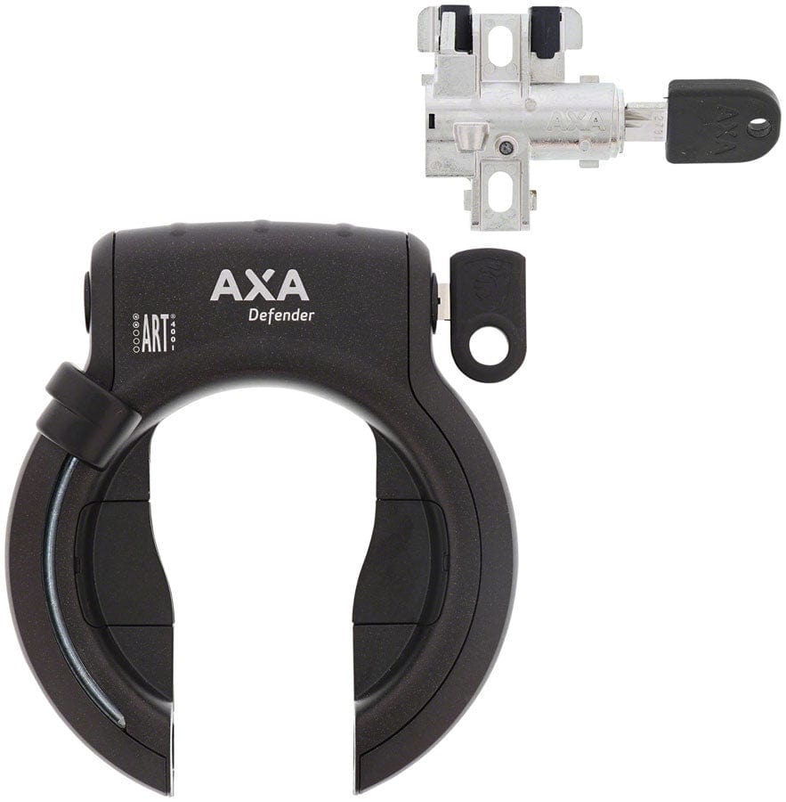 The AXA Ring Locks are high quality frame locks with an innovative design and optimal safety with its anti drilling cylinder and hardened steel bracket. The ergonomic design of the push button and the luxurious foldable key with online key service offer you maximum comfort. The Ring Lock paired with a key-matching battery lock keep your ebike secure.Defender ring lock with E-bike battery lock The ring lock has maximum security with plug in option Hardened steel bracket and lock housing Anti drilling plate in cylinder Replacement Keys can be ordered through AXA