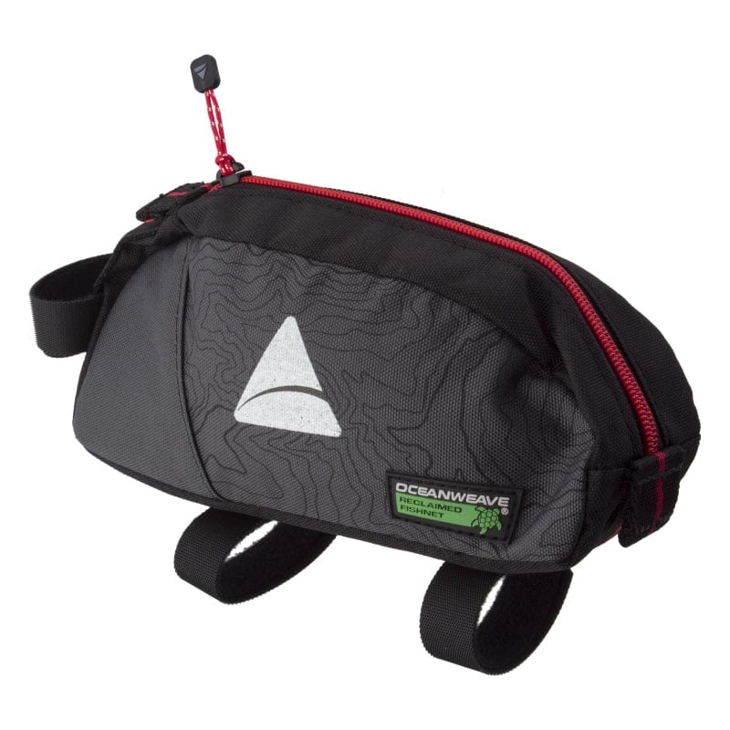 Oceanweave 600D reclaimed fishnet polyester with waterproof polyurethane coating. Soft-lined phone pocket is large enough to hold most modern phones and doubles as a sunglasses pocket. Webbing ladder offers endless fastening points - Simply cut the supplied Velcro to size. Zipper closes towards the front keeping things neat and tidy when running a lighting system. Leading edge polypropylene stiffeners help to maintain bag shape. Water-resistant stitched construction. 4 Velcro trim-to-length straps included. Wedge-shaped front enhances stem strap support. Zipper pull tabs for easy operation while wearing gloves