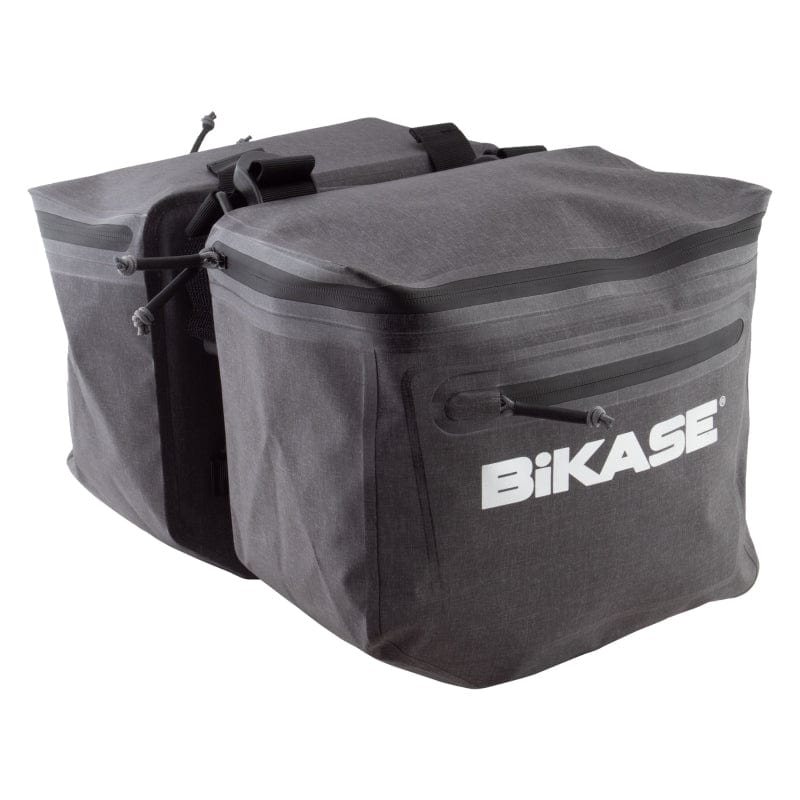 Dual panniers that simply throw over the top of your rack. RF Sealed construction with water resistant zippers will keep your stuff dry!. Adjustable to different widths of racks. Made of water resistant PVC/TPU. Reflective accents for improved safety