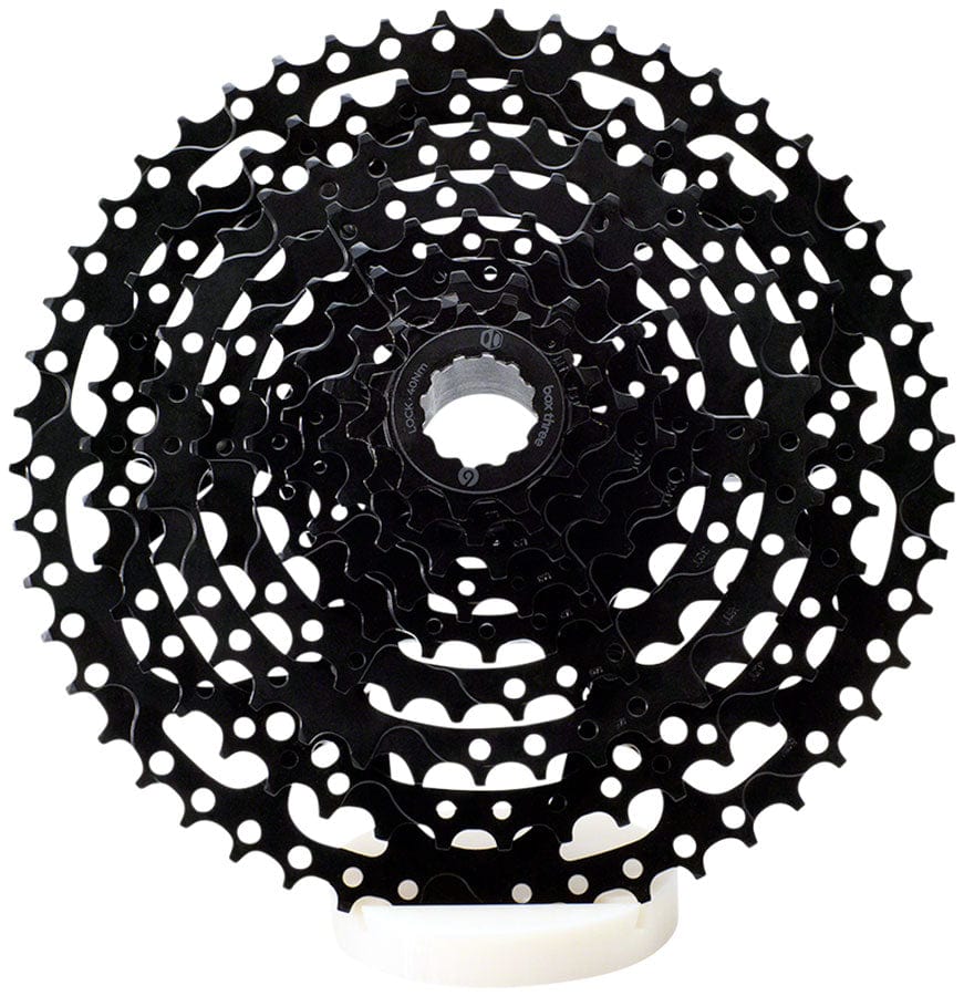 The Box Three Prime 9 cassette is a great all-around cassette option. All cogs are stamped from steel and subsequently the larger ones are pinned to alloy spiders. It also features weight-reducing holes on the cogs.