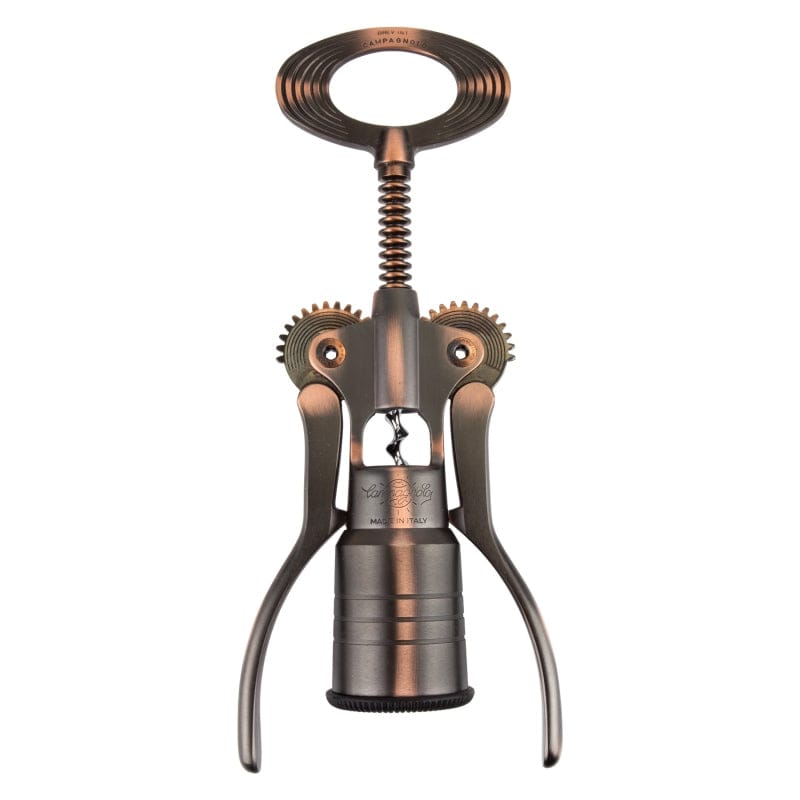 Collectors corkscrew from Campagnolo built entirely in Italy with the same attention to detail as their cycling components. A telescopic self-centering bell positions the screw exactly in the middle of the cork and once screwed down the two levers pull the cork out easily and delicately. Quality materials and careful finishes accompany the sinuous shapes of its various parts - Each component is a characteristic feature of the Campagnolo brand. Newest V2 model features higher quality materials and an improved finish