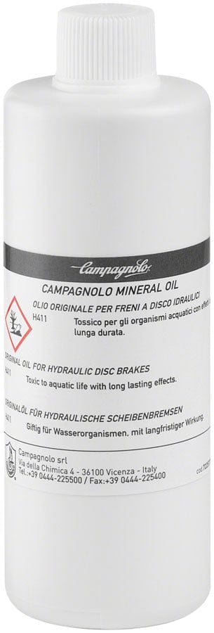 Low viscosity mineral oil for use with Campagnolo hydraulic brake systems.Does not absorb water so regular bleeding is not necessary Non-toxic and will not irritate skin Will not damage frame finishes