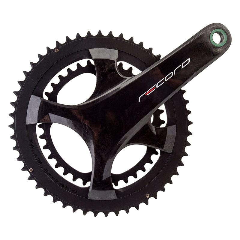 An updated design with the same dimensions of previous years. The new Record 12x2 Speed crankset can be installed on any type of frame whether or not it is being used with disc brakes because it optimizes the chain line on the frame with a rear hub flange measuring 130 135 or 142 millimetres without affecting the Q factor that remains constant at 145.5 mil. The innovative design of the outer chainring ensures faster quieter derailing owing to the contoured pin while the symmetrical design of the inner chainring teeth allows improved stability with chain crossovers. Unidirectional carbon fiber cranks steel axle and aluminium chainrings. Optimized design for every chainring combination