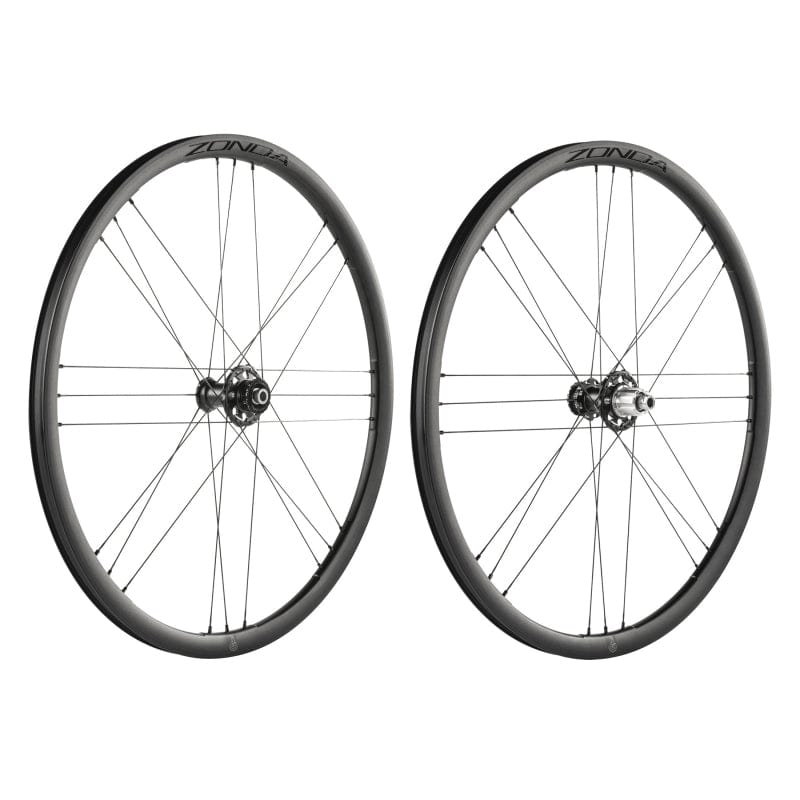 The new Zonda GT aluminum wheelset has been redesigned to perfectly compliment the new EKAR GT drivetrain. Tried and true C23 base with H29 profile is able to accomodate both wider gravel tires and more narrrow road tires. The angular nature of Campagnolo`s cup and cone bearing bead contact allows the bearings to effectively displacelateral radial and axial loads and provides an optimum rolling resistance. G3 lacing features groups of three parallel straight-headspokes in a 2:1 ratio a design which enhances tension balanceincreases stiffness and amps up power transmission. N3W driver allows the use of starter sprockets as low as 9t and provides unmatched smoothness and delivering maximumtorsional stiffness. 2-Way-Fit system allows the use of either tubeless or classic tubed tires without sacrificing performance or safety. Self-Lock aluminum nipples prevent spokes from loosening even under extreme or prolonged vibration