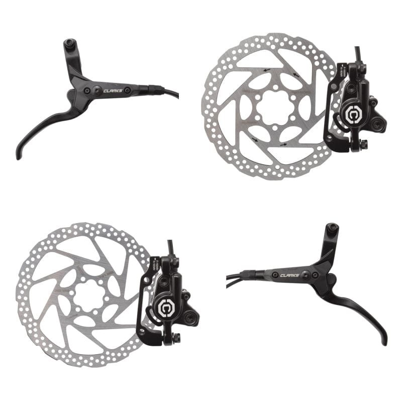 Dual piston hydraulic brakes with integrated electic motor cut off sensor for use with E-Bikes. Compatible with International Standard or Post Mount brake mounting types. 3 finger lever with built in reach adjustment for fine tuning. Motor cut off sensor uses Juliet Male 8 (2 pin) connector. Includes spare olives for reducing hose length
