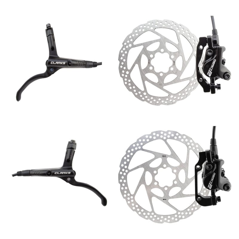 React 2 dual piston brakes bring high tier control and braking to an accessible price point for MTB and hybrid use. Complete kit includes front and rear calipers levers pads stainless steel rotors hoses fittings and additional olives for custom hose lengths. Split lever clamp can be installed without having to remove grips or accessories. Compatible with Internation Standard and post mount configurations. 2 piston hydraulic brake caliper with self adjusting pistons . Integrated lever reach adjustment to suit all hand sizes. Uses enviromentally friendly mineral oil