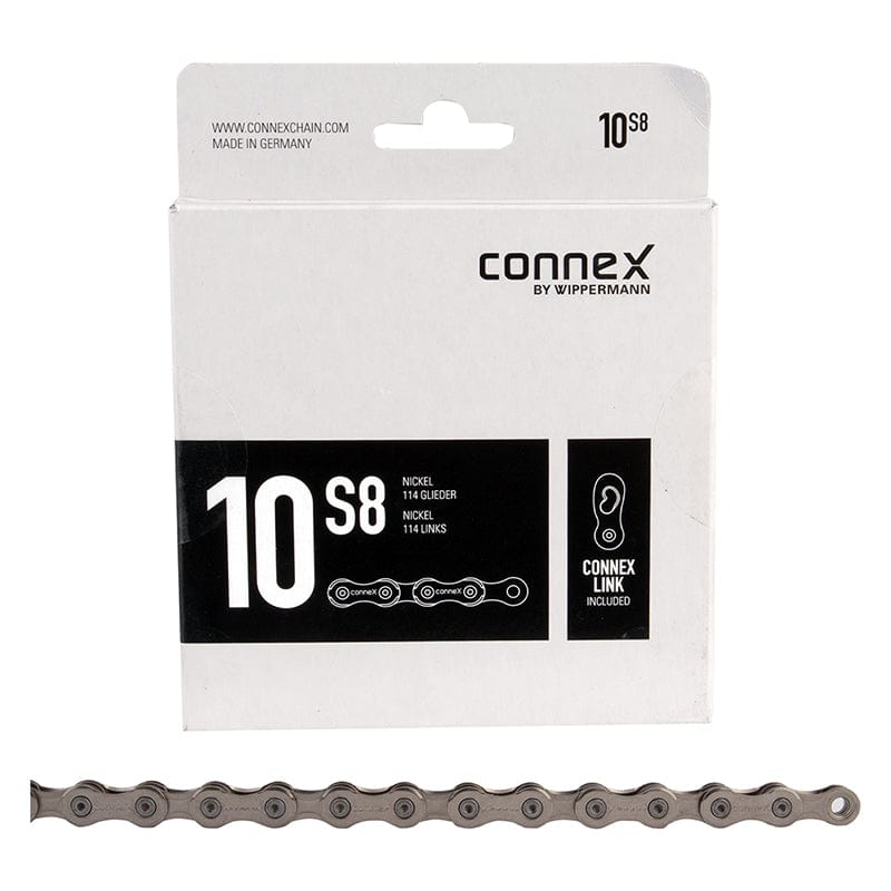 The high-grade nickel coating on the 10s8 provides outstanding protection against corrosion. As with all 10 speed chains now includes chamfered high performance plates by Connex for improved shifting characteristics. Compatible with all 10 speed systems. 114L - 264g