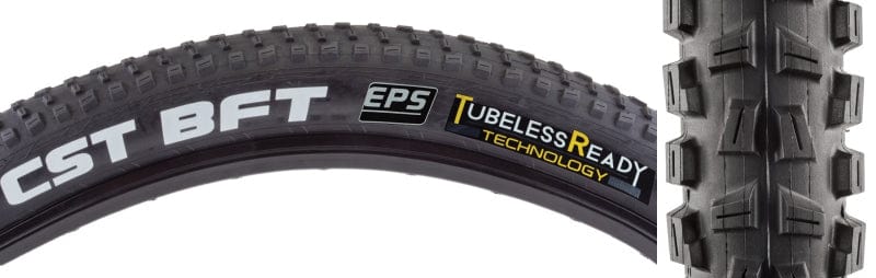 Features meaty center and side knobs combined with a high-volume casing to create the ultimate aggressive all-mountain/freeride tire. The BFT offers predictable cornering and excellent braking traction. DC - Dual Compound tread provides a lower rolling resistance center paired with extra grip for the corners. EPS - Exceptional Puncture Safety offers an added layer of proprietary rubberized poly-fiber material between the tread and the casing to help prevent punctures. TR - Tubeless Ready compatible with sealant based tubeless systems or with tubes