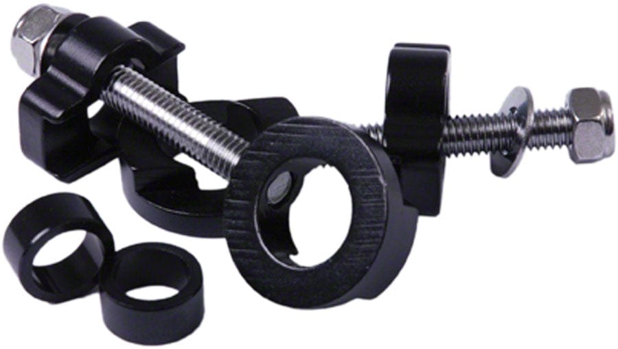 A pair of chain tensioners designed to work with horizontal drop outs.Dropout guide keeps tensioner centered in frame Lock nut prevents unwanted readjustment