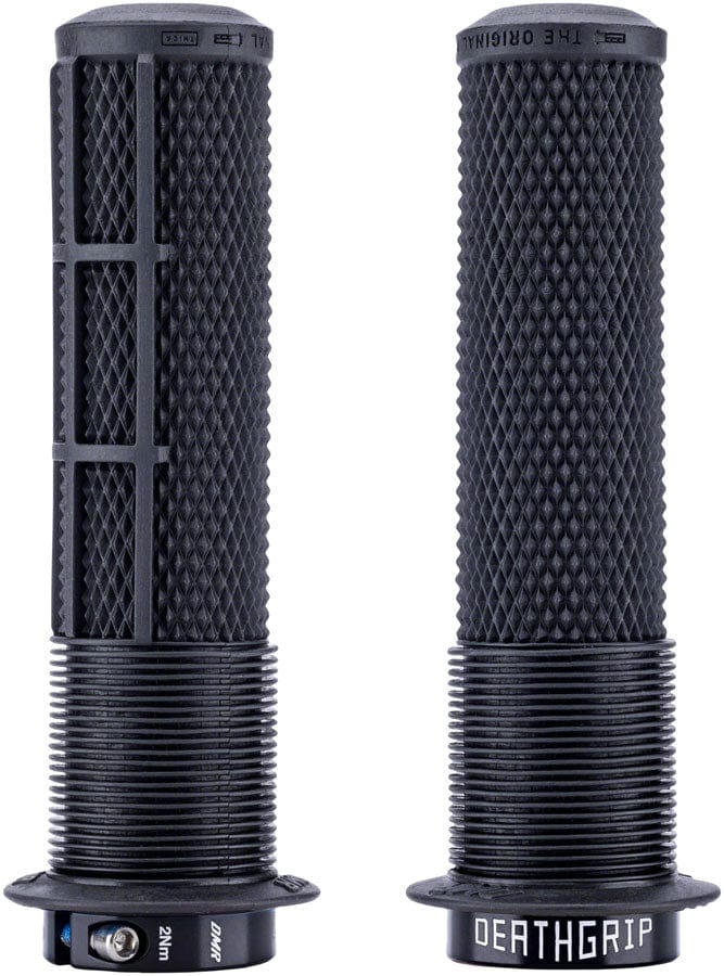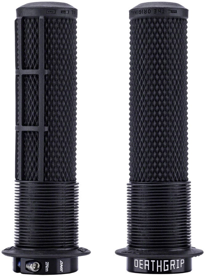 The Deathgrip2 features the grip pattern and layout that inspired a whole generation of mountain bike grips – it starts with a soft mushroom section for comfort in the thumb and forefinger area preventing blisters in a soft-tissue zone. Next the grip pattern features diamond knurl for grip in all conditions and all terrains – and the waffle layout underside holds your fingers in the perfect position for grip and control. A tapered core means the Deathgrip2 is firmly mounted onto your handlebars with ease and the use of just one lockring keeps things simple and tight. The krayton rubber grip compounds used are soft and comfortable yet durable and lightweight. Deathgrip2s are designed for optimal grip comfort and control whether you ride with or without gloves. They’re the perfect choice for every rider – for weekend thrashers dedicated freeriders or whether you race Hardlines World Cups or ride Rampages. Deathgrip2s are the grip of choice for everyone.Soft 20A durometer krayton rubber grip with flange and injection molded DMR logo end cap Tapered core – no need for outer lockring with a secure hold using a Slimline aluminum lock-ring collar Waffle pattern – for comfortable finger placement and confident grip Knurl – for all over grip in all conditions Mushroom – for comfort in thumb and forefinger area Two thickness options – choose either 31.3mm (thick) or 29.8mm (thin) Lightweight – just 100g per pair