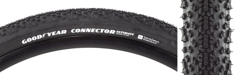 Versatile tread pattern featuring tightly-spaced center knobs combined with aggressive side knobs is mated to Goodyear`s Tubeless Complete construction. From gravel adventuring to drop-bar dirt mashing the Connector is capable of tackling any terrain. S4 - Silica4 Formulated to maximize rolling efficiency while providing class leading grip in wet conditions. ULT - Lighweight casing fabric utilizing smaller thread fabric. This casing uses less rubber-making the tire more supple and faster rolling with improved traction