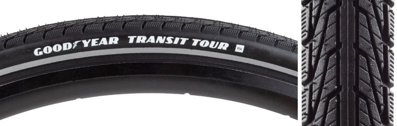 Modeled after Goodyear`s Assurance All-Season automobile tire the Transit Tour combines a durable utilitarian construction with directional siped tread that offers unsurpassed all-weather traction. Meets and exceeds safety standards for use on modern e-bikes. DYC - Dynamic Compounding formulated for on-road applications with an emphasis on durability