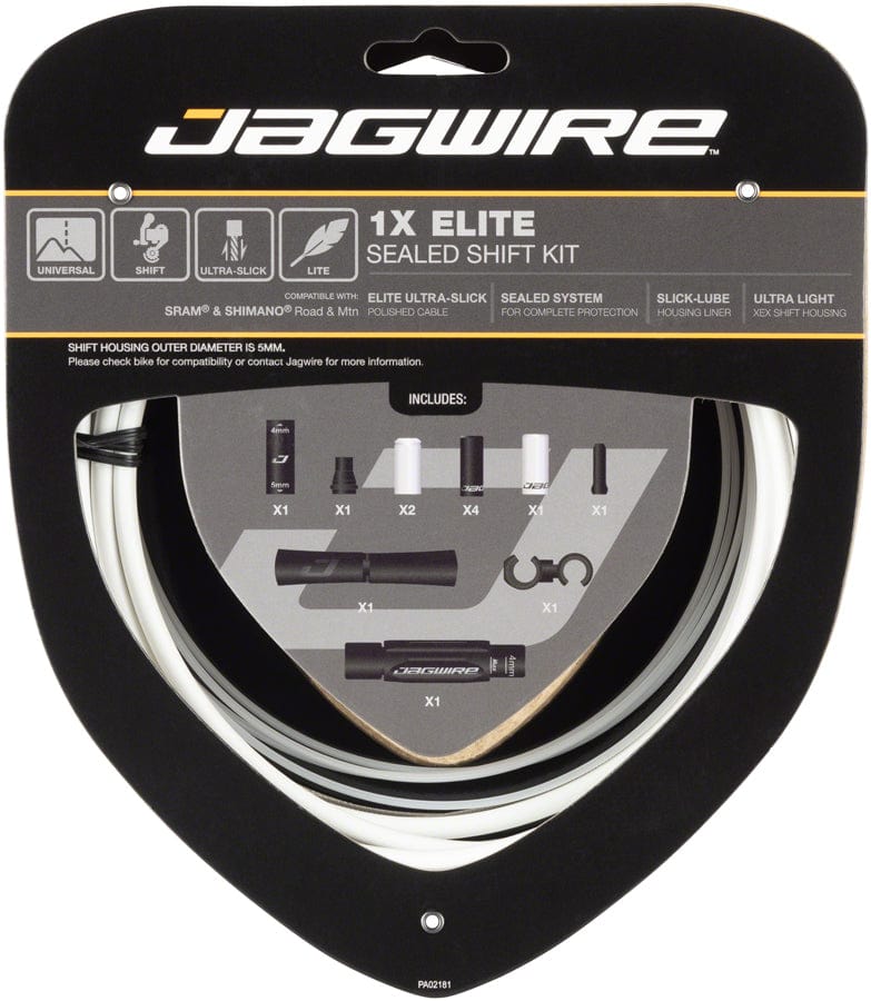 Jagwire 1x Elite Sealed Shift cable & housing sets protect against dirt water and other contaminants. Compatible with both road and mountain bikes with 1x drivetrains the kits include an ultra-slick polished inner cable along with a continuous Slick-Lube liner to ensure that protection against the elements does not come at the expense of top level performance.Elite Ultra-Slick polished inner cables and Slick-Lube liners dramatically reduce friction The included grub seal is placed on the end of the liner to keep contaminants out of the cable system Small parts are included for installation on either dropbar or flatbar bikes Includes enough housing for full length housing runs on most 1x-equipped bikes XEX housing is 30% lighter than traditional shift housing The single-ended SRAM/Shimano compatible cable end is weld-cut for easy installation 1x kits are designed for use with rear derailleurs or internally geared hubs only