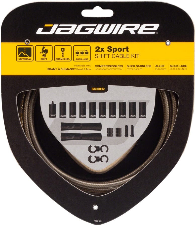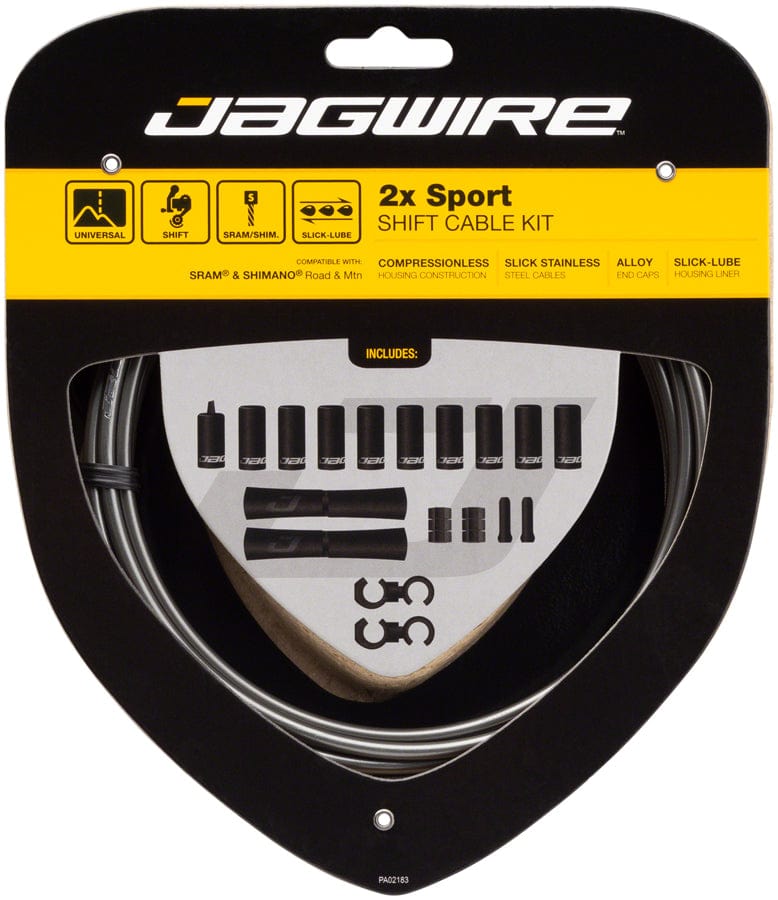 Jagwire 2x Sport Shift cable kits include everything you need to replace the front and rear derailleur cables and housing on a bike.Sport Slick Stainless inner cables resist corrosion and are die-drawn to reduce surface friction Compressionless LEX-SL housing uses Slick-Lube liners to protect the cables and ensure consistent performance Sealed end caps help keep contaminants out of the housing Single-ended SRAM/Shimano compatible cable ends are weld-cut for easy installation