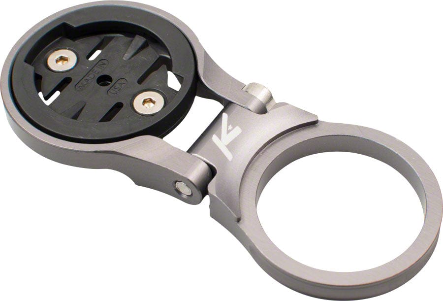 CNC machined aluminum Garmin computer mount for secure and protected placement above all stems.1-1/8" steer tube mount with adjustable angle for the Garmin Edge computer Features turn Garmin interface fits Edge computers and can be oriented for the Forerunner 310XT (not compatible with the 910XT due to the shape of the quick release adapter) Mounts computer above or below stem replacing 5mm spacer 50mm extension with +/- 20 degree angle adjustment Precision machined anodized 6061 T6 aluminum Weight: 25g Lifetime warranty