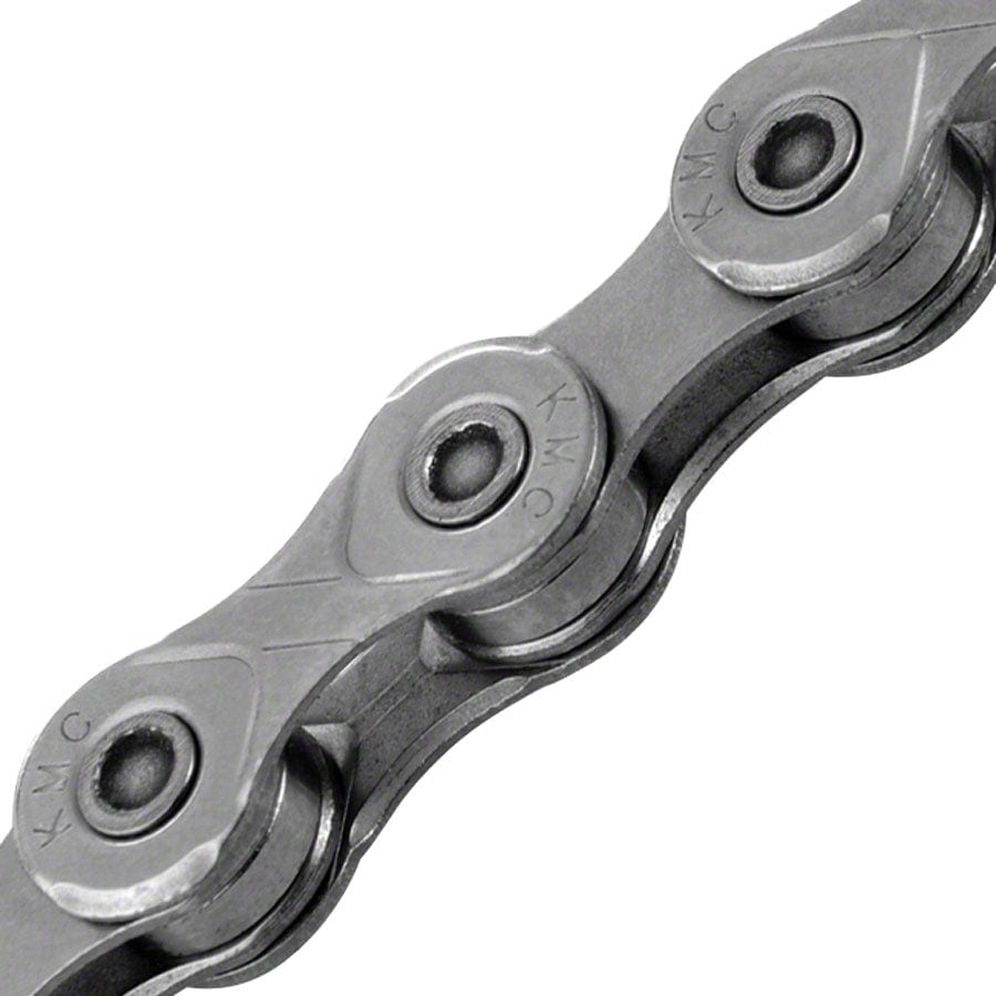 Solid pins inner and outer plates make for an economical chain choice with all the performance of higher level X-Series chains.1/2" x 11/128" chain is compatible with Campagnolo Shimano or SRAM 10-speed systems Features KMC's highest pin power for unsurpassed riveting geometry KMC's Double X durability Double ”X” bridge shape allows for precise gear shifting Outer plate chamfering allows for accurate shifting Inner plate chamfering allows for expeditious shifting