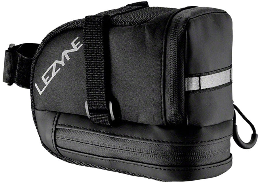 The L-Caddy sports fitted pockets for a patch kit tire levers multi tool and cash as well as a main cargo area for up to two spare tubes.Thin low-profile design tucks gear away from legs Interior pockets feature painted logo Triple-strap anchor system Features fitted pockets specifically designed to fit and easily access other Lezyne accessories