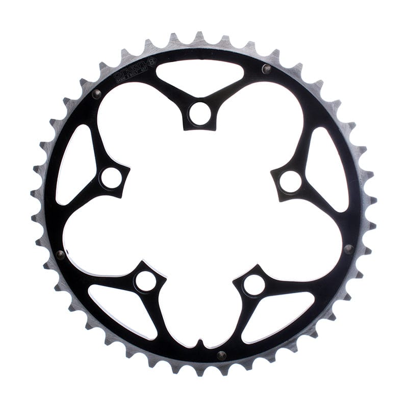 CNC machined AL6061-T6 alloy construction. 8 9 and 10 speed compatible. Available in ramped/pinned and standard styles. Black anodized finish with machined silver teeth. Made in the USA